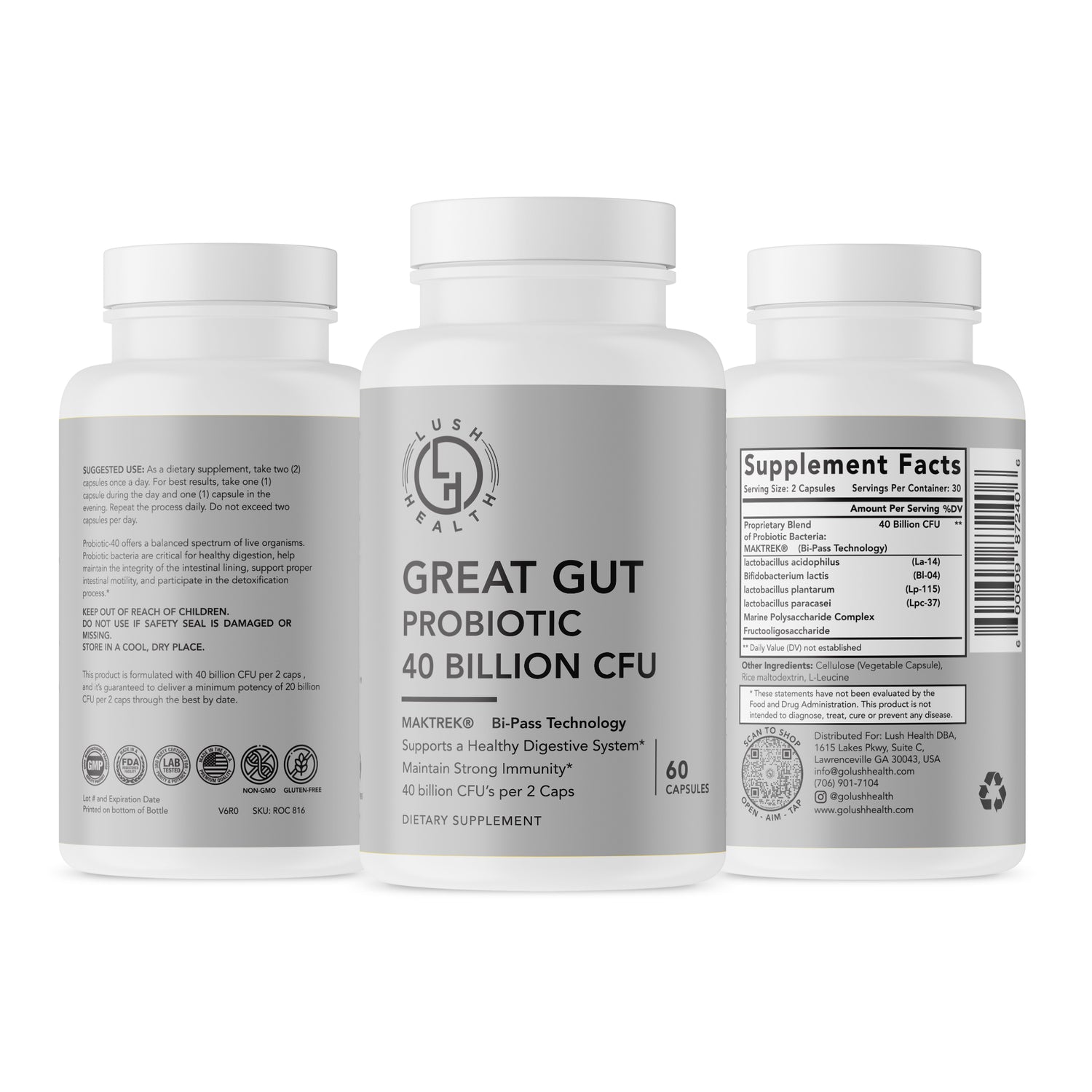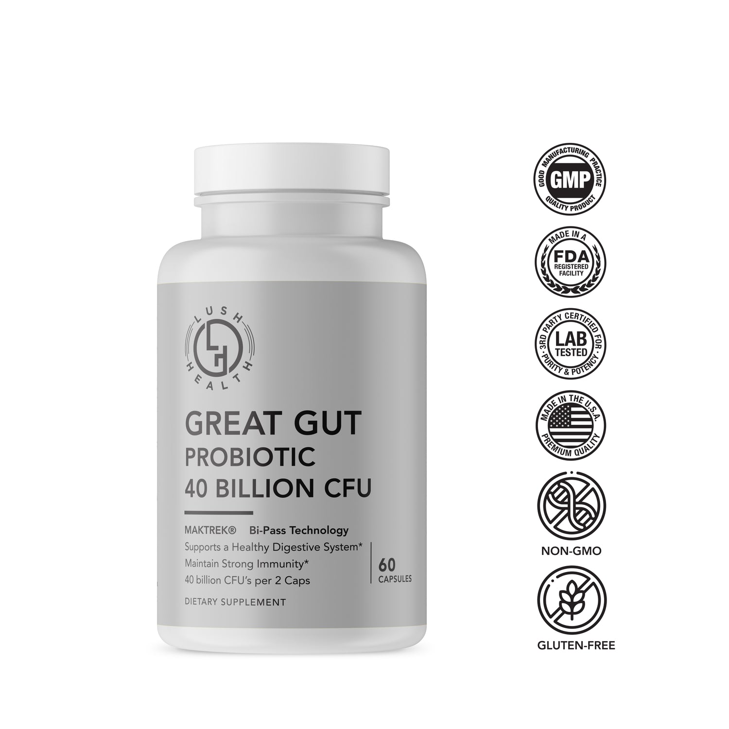 - Minimum of 20 Billion CFU Per Capsule: Most probiotic supplements contain only 10 billion colony-forming units (CFU) per dosage. With Lush Health’s Great Gut Probiotic, you are guaranteed twice the usual amount in each capsule.